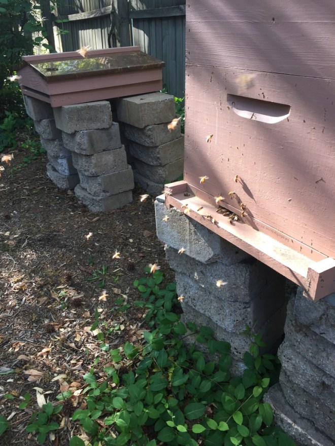 And one seems lost, dazed, it’s spinning on the ground. Dipping into the royal jelly? Pub crawl.